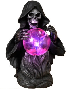 Gevatter Tod schaut in die Glaskugel. Was er wohl sieht? Stellt unseren eindrucksvollen beleuchteten Sensenmann mit Kugel auf dem Tisch und fragt euch, warum der Grim Reaper so fröhlich aussieht. Das kann doch nichts Gutes bedeuten für euch, oder? Ob er wirklich die Zukunft voraussagt? Und warum ist sie lila? Fragen über Fragen, die man vielleicht gar nicht unbedingt beantwortet haben will.