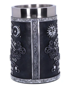 Der silberne Kunststein des Mittelalter Kelchs Ritter liegt angenehm in der Hand und dank der genoppten Struktur gleitet der Fantasy-Kelch auch bei nassen Händen nicht so leicht aus der Hand. Das stilisierte Konterfei eines schwer gepanzerten Ritters, der sich auf sein Schwert stützt, prangt auf zwei Seiten der Gothic-Tischdeko, welche aufwändig mit verschlungenen, goldenen Symbolen und zwei roten Edelsteinen am Griff geschmückt wird. Der Edelstahl-Einsatz ist von Hand einfach zu reinigen. Unten am Fuß des Fantasy-Geschenkartikels ist ein Stück Filz befestigt, sodass Oberflächen nicht zerkratzt werden. Dazu passen das Mittelalter Ritterschwert und die Goblin Schuhe Braun grün.
