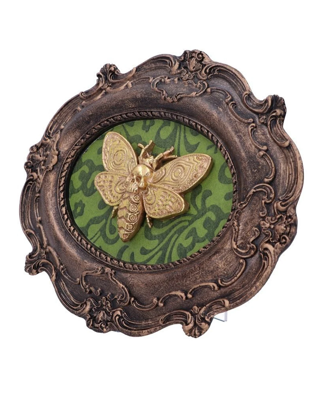 Das außergewöhnliche Wandbild ist aus feinstem Polyresin gegossen und in Bronze und Gold ausgeführt. Im Inneren des runden Bronzerahmens sitzt eine goldene Atropos Totenkopf Motte, auf ihrer Rückseite befindet sich ein goldener Schädel, die Flügel der Motte scheinen seitlich aus dem Schädel hervorzustehen. Die Motte ruht auf einem kunstvollen lindgrünen Hintergrund. Das Totenkopfschwärmer-Motte Wandbild ist ein einzigartiges Geschenk für jeden, der sich für makabere Kuriositäten und gotische Themen interessiert.